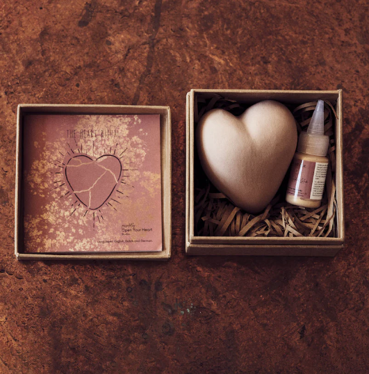 Je lijmt het hart met de bijgeleverde kintsugi-goudlijm. Jij bepaalt het tempo. Jij bepaalt de ruimte. Het lijmen met goud is een proces van heling — niet omdat de breuk verdwijnt, maar omdat je laat zien: dit is gebeurd. En ik ben er nog.